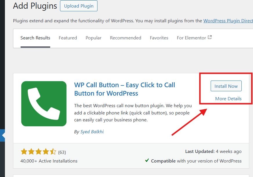 2. Search for “WP Call Button” and install it and activate it.