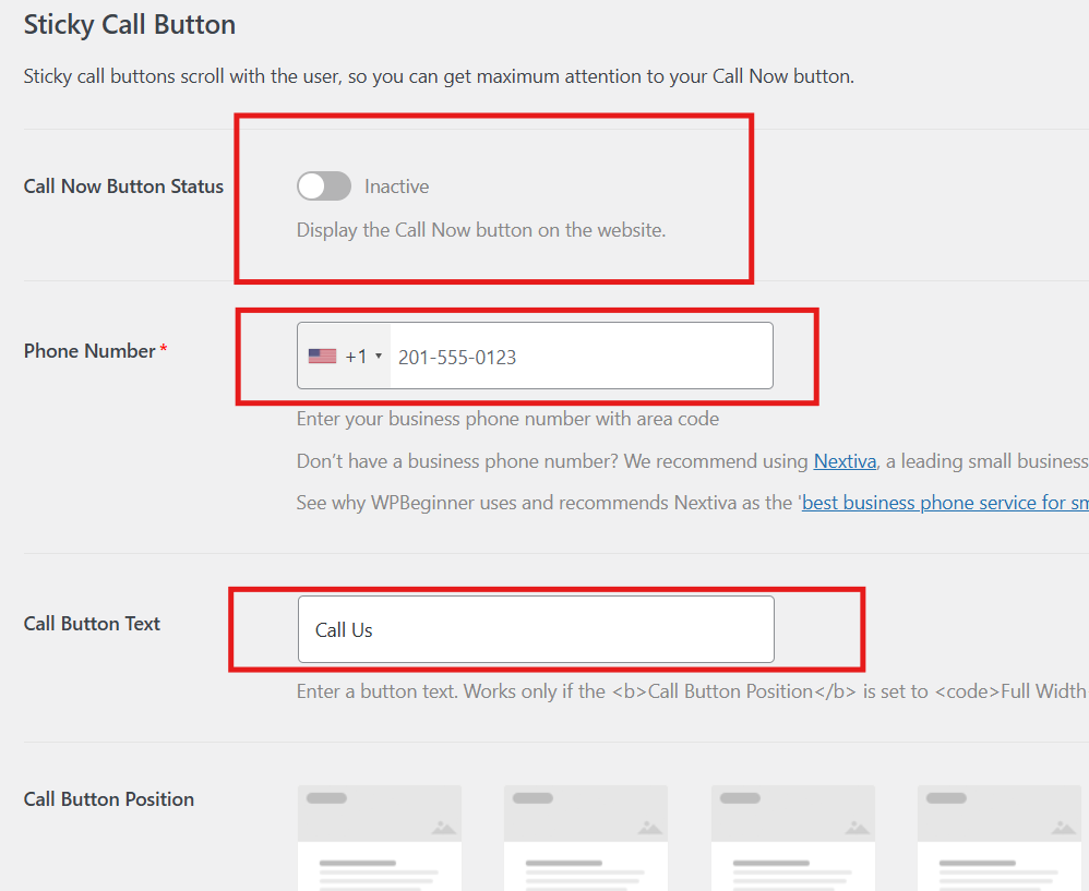 4. Enter your phone number and customise the button text (something like “Call Us Now” works well).