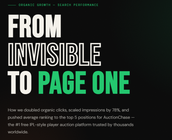How we doubled organic clicks, scaled impressions by 78%, and pushed average ranking to the top 5 positions for AuctionChase — the #1 free IPL-style player auction platform trusted by thousands worldwide.